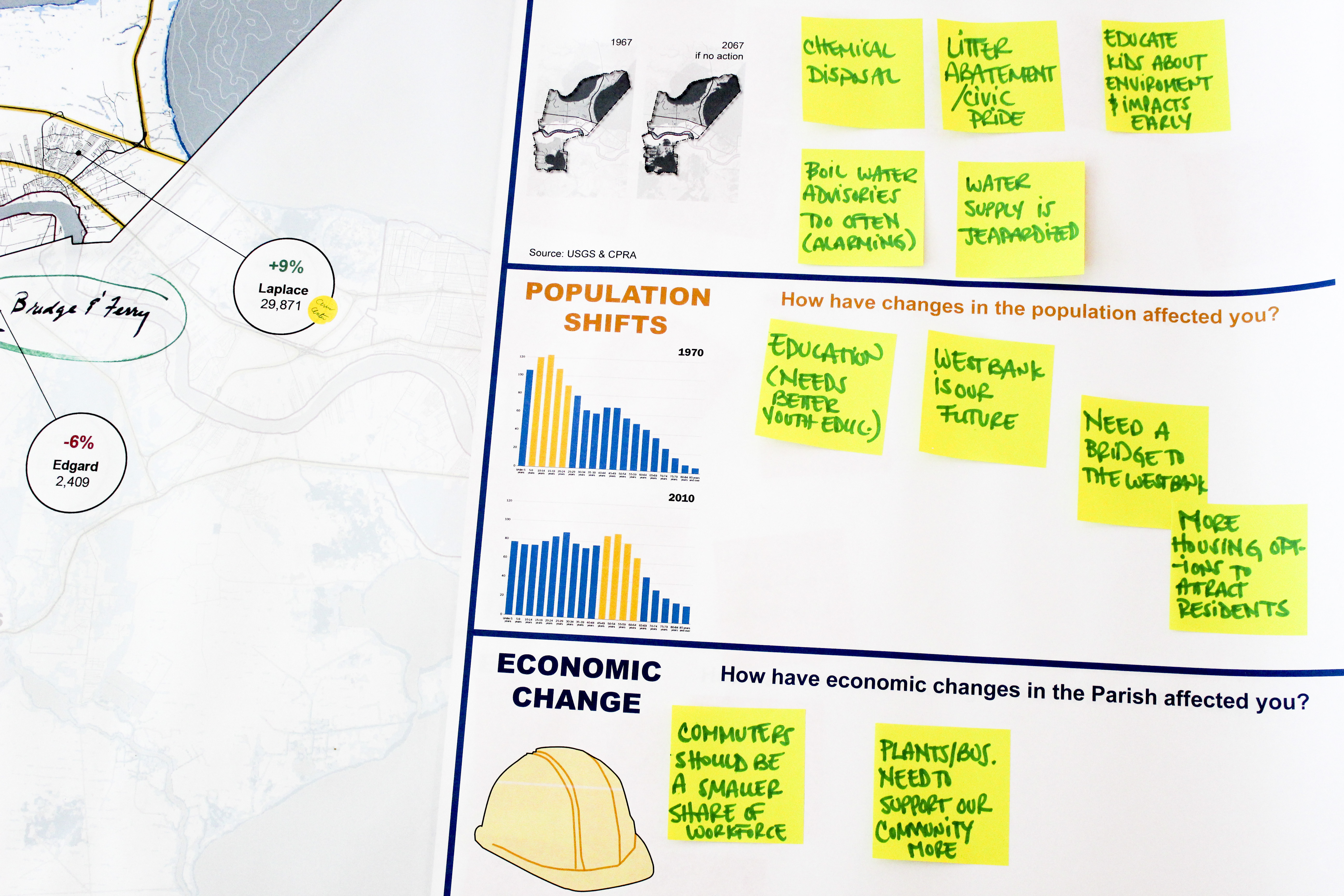 Throughout the LA SAFE process, stakeholders recognized that thinking and cooperating regionally is instrumental to adapt to increasing risk and to create a resilient and vibrant coast in support of the state and the nation. Parish residents discussed the impact of land use decisions on the region, the need to coordinate transportation and economic development efforts for the betterment of all residents, and the impacts of water management actions on adjacent parishes, especially along bayous and rivers. They expressed their shared concerns about their ability to live on the coast, to retain their young people, to maintain their businesses and attract workers, and to provide amenities to enhance everyone’s quality of life.
